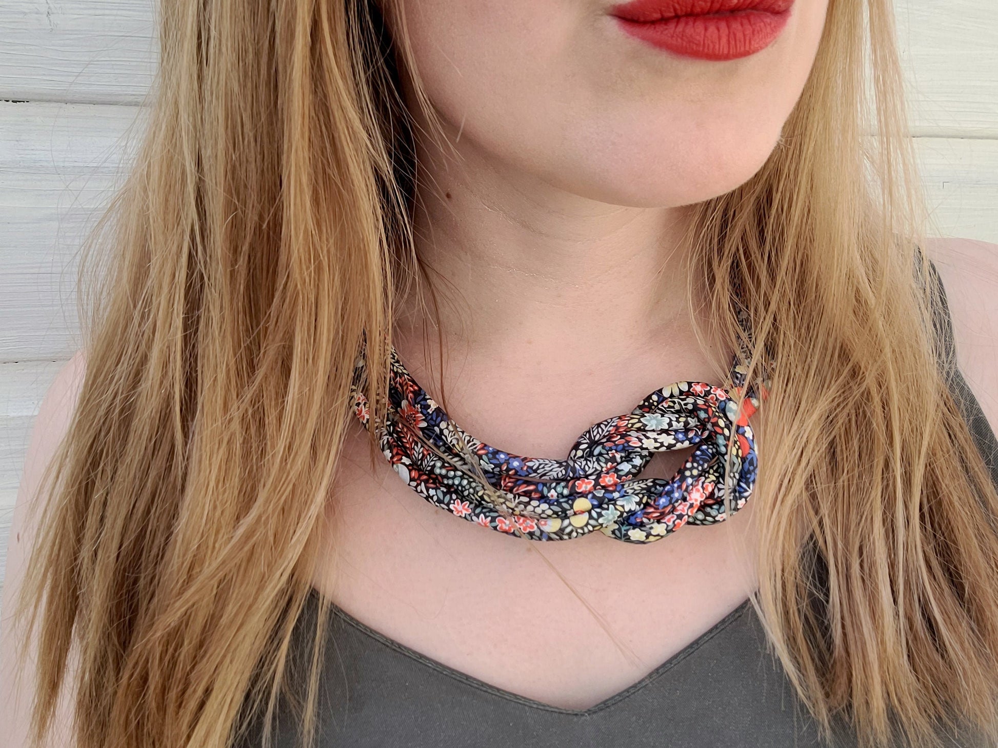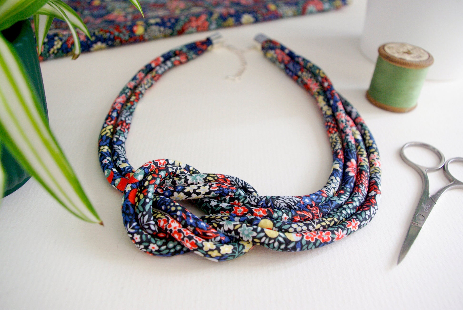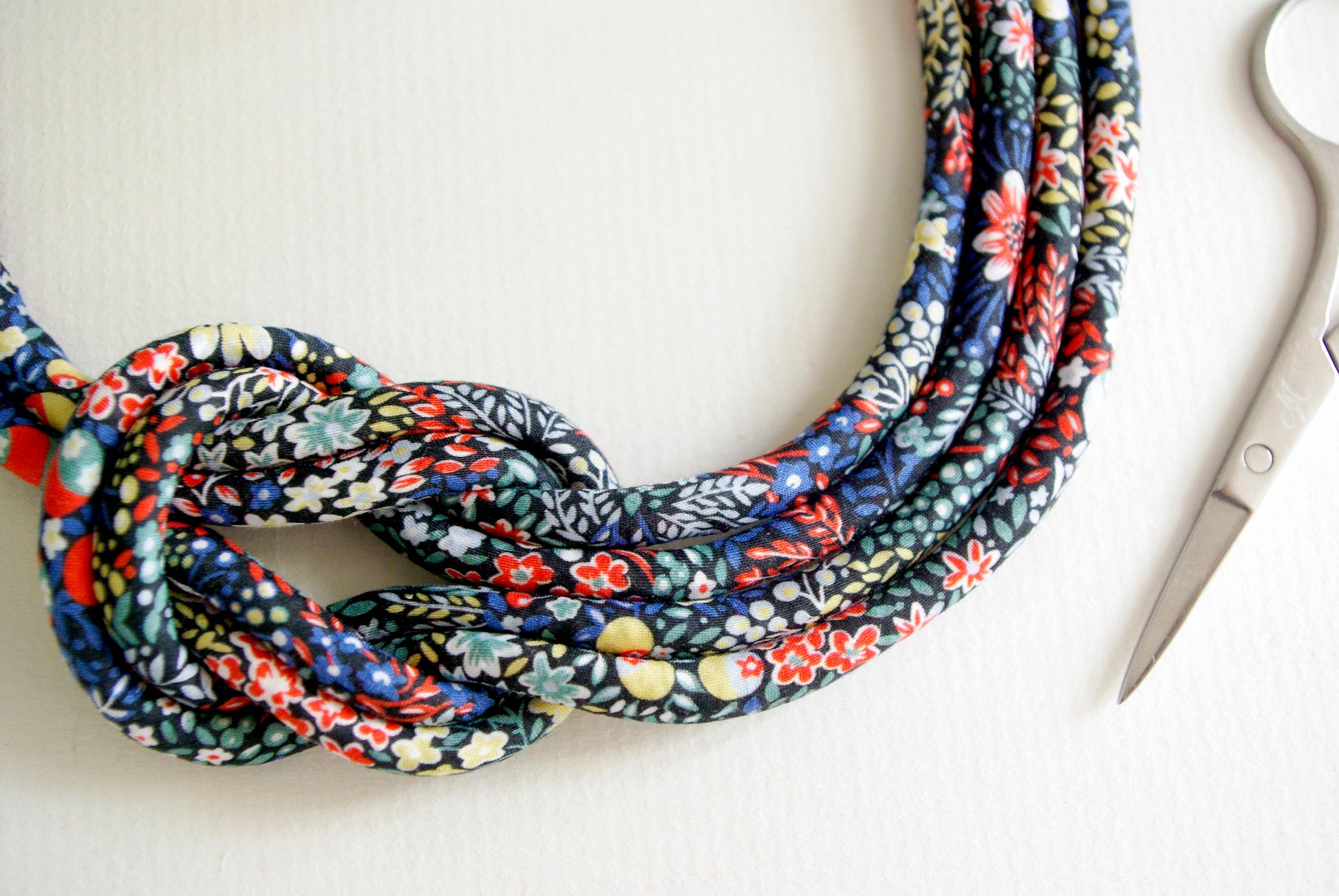 The necklace is an unusual reef knot formation made from cotton piping cord that I have covered myself in Liberty Tana lawn. The fabric a ditsy floral design called Elderberry in reds, blues, pale green and yellow on a very dark blue background. This particular print is reminiscent of hedgerow flowers and cottage gardens.