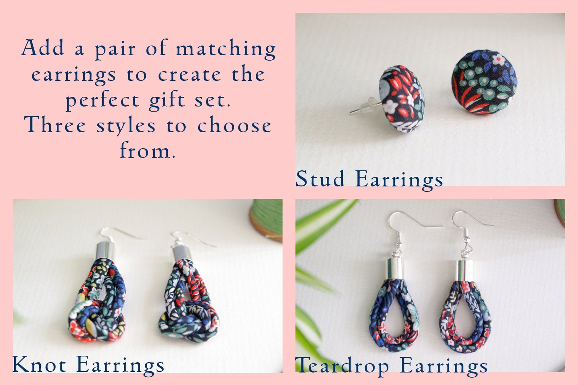 This statement textile necklace is made from genuine Liberty of London tana lawn which has been hand cut by me on the bias then sewn around a chunky cotton piping cord core. The fabric is a ditsy floral design called Elderberry in reds, blues, pale green and yellow on a very dark blue background. This particular print is reminiscent of hedgerow flowers and cottage gardens. The placement of the flowers will vary with each necklace making it totally unique to you! You can even add a matching pair of earrings to make a beautiful gift set, just choose from one of the three designs in the drop-down menu.