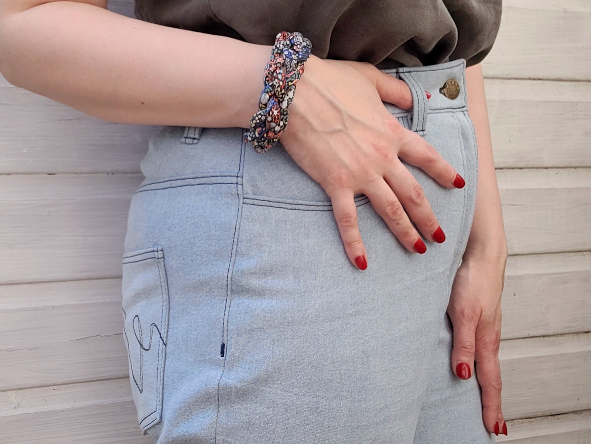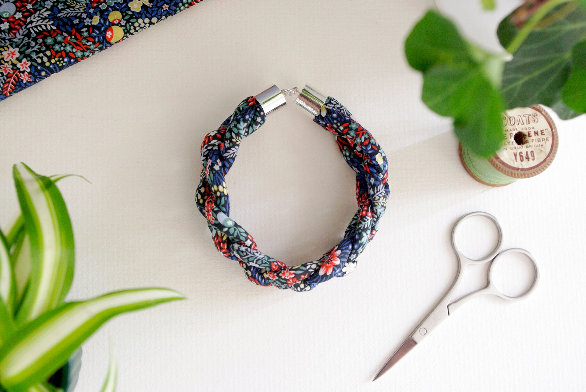 The bangle is a four strand braid made from cotton piping cord that I have covered myself in Liberty Tana lawn. The fabric is a ditsy floral design called Elderberry in reds, blues, pale green and yellow on a very dark blue background. This particular print is reminiscent of hedgerow flowers and cottage gardens. The placement of the flowers will vary with each necklace making it totally unique to you!